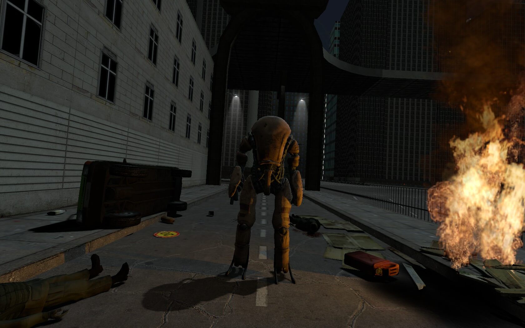 Я так понимаю, это странное существо (суперсолдата) можно было также найти в бета-версиях Half-Life 2. Он в какой-то степени похож на страйдера…впрочем, неважно. Это заскриптованный NPC, и он будет делать всё то же, что и должен был в оригинальной игре. С теми же перками и анимациями.
