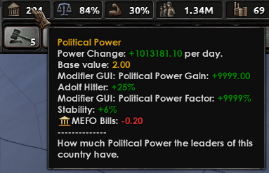 Читерский мод, который позволяет через графический интерфейс в самой игре устанавливать значения модификаторов. Хотите более быстрый прирост политической силы? Хотите, чтобы армия получала больше опыта? Может быть, нуждаетесь в баффе производства? Всё решаемо с помощью ModifierGUI.