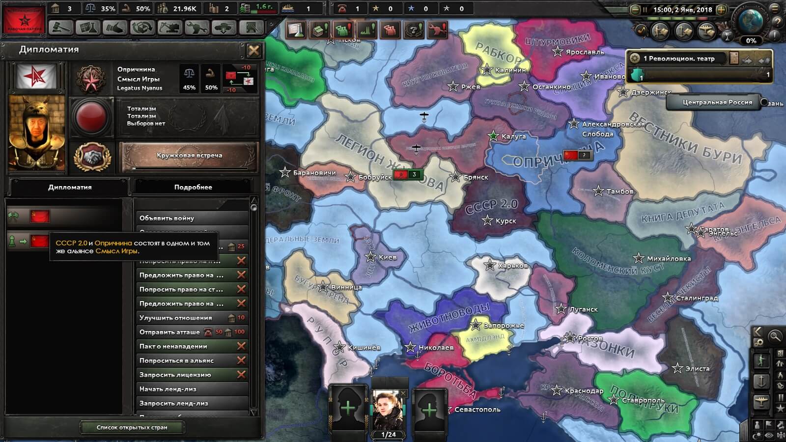 Спустя десятилетие остатки левых сил любого оттенка тонкими ручейками караванов и бегунов объединились под знаменем Хартии Антиолигархичесой Интернационалистической Политики (ХАИП), построенной на основе довоенных идеалов рабочей демократии. Территорию страны условно поделили за каждым пабликом, который де-юре всего лишь администрирует работу своей новой области. Единогласно согласились, что в своём регионе каждая организация должна путём научного подхода осуществлять полноту демократии. На деле с ростом амбиций каждого региона говорить о каком-либо единстве стало невозможно и кровопролитное столкновение является лишь вопросом времени.