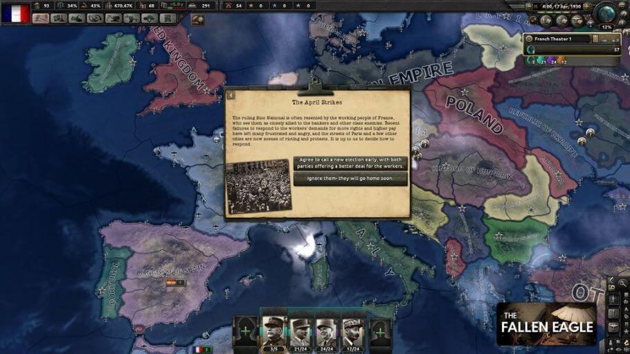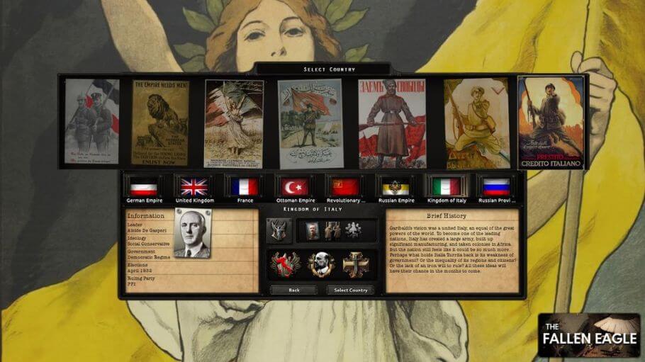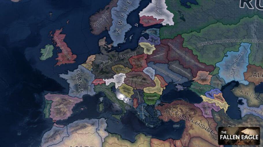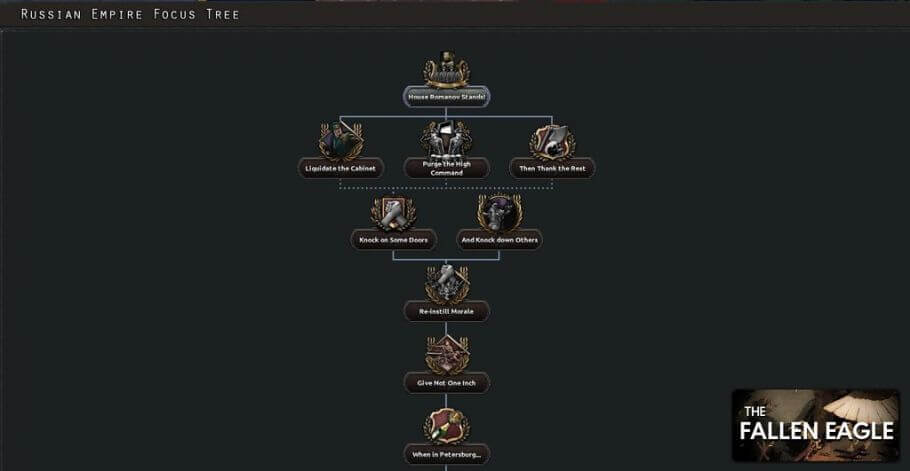The Fallen Eagle – это модификация по альтернативной истории, где собственно и не происходило Первой Мировой войны. В большинстве своем мод сосредоточен на России, но имеются и фокусы у большинства мажоров, плюс пару миноров (привет БОГемия, и великая Саудовская Аравия(кто-то за них играет?))
